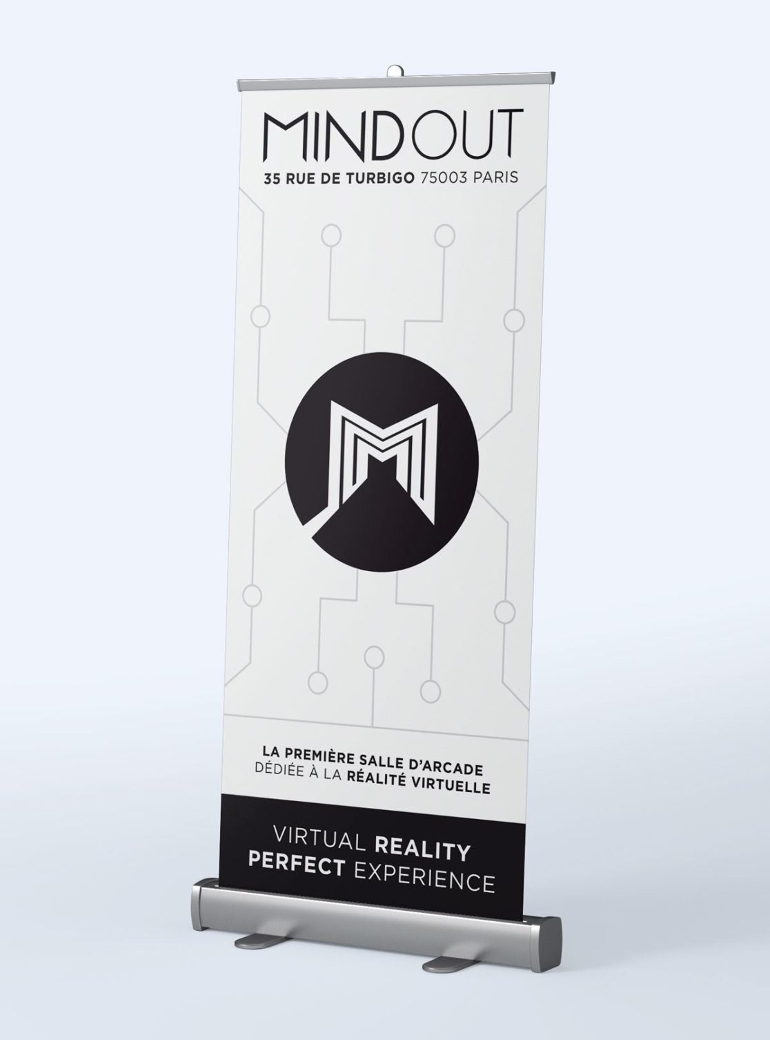 Création de l’identité visuelle de MindOut, la première salle d’arcade en réalité virtuelle de Paris, en collaboration avec Marine Dupuis.